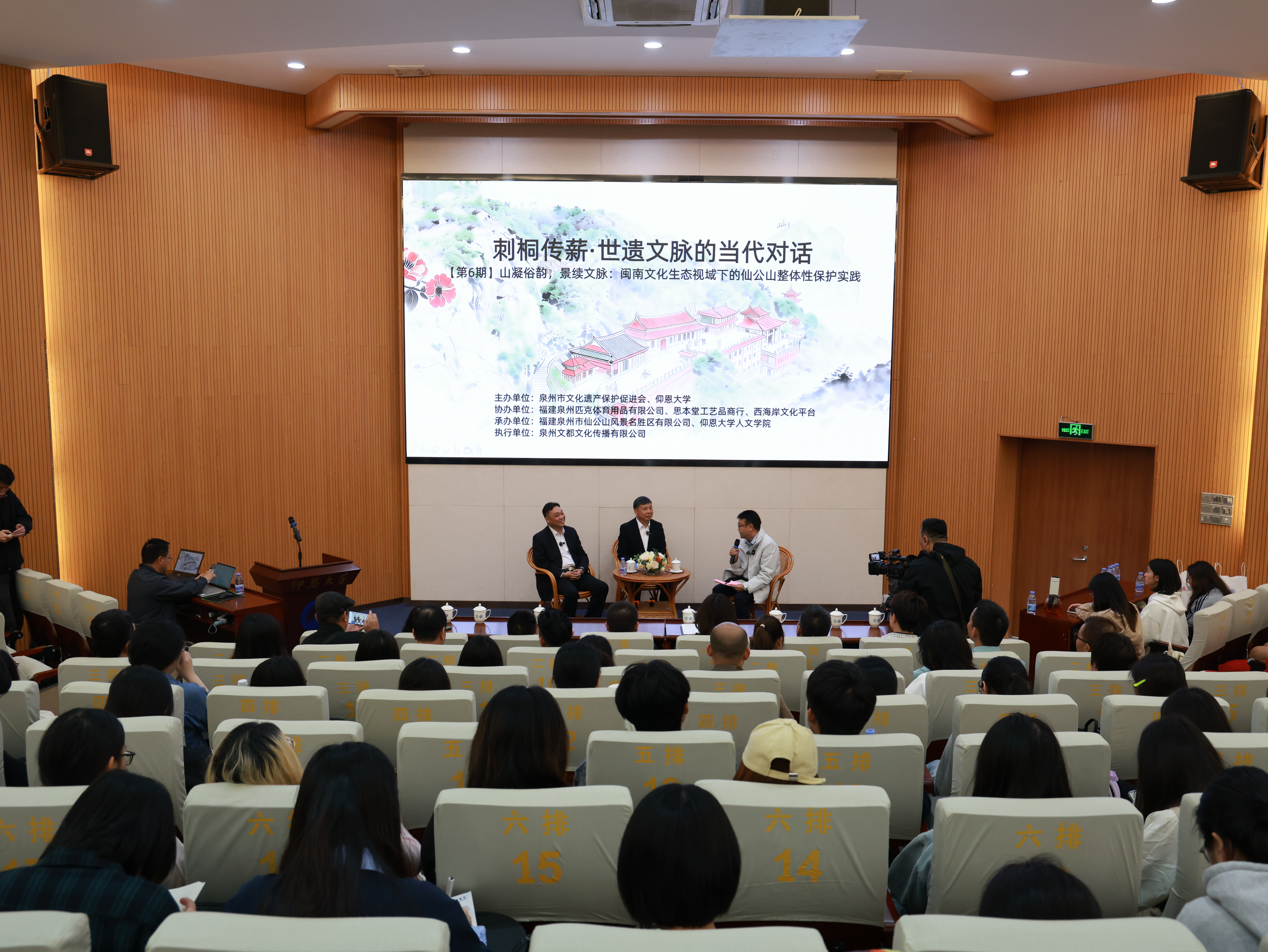 3月26日下午,“刺桐傳薪:世遺文脈的當代對話”系列主題活動第六期在我校第一教學區多功能報告廳舉行。專家學者、文保單位管理者及文化傳播志愿者圍繞“山凝俗韻,景續文脈:閩南文化生態視域下的仙公山整體性保護實踐”主題,共同探討文化遺產整體性保護的前沿路徑。仰恩大學董事會副董事長吳浩鈴、董事董俠岐,校黨委副書記程如平等出席活動。嘉賓對話環節仰恩大學董事會副董事長吳浩鈴、董事董俠岐等出席活動在嘉賓對話環節上,福建泉州市仙公山風景名勝區有限公司總經理、閩南文化傳播志愿者杜筑成,泉州浩然書院院長、廈門大學平潭研究院客座研究員陳少佑(瀟風)擔任對話嘉賓,泉州市文化遺產保護促進會副秘書長劉平一主持。他們聚焦省級文物保護單位仙公山,重點探討非物質文化遺產與物質空間深度融合的“文化景觀”保護范式,就如何科學保護歷史建筑、摩崖石刻等物質載體,以及系統記錄、闡釋和轉化傳說、儀式、節慶等非物質要素展開深入交流,探索區域性文化遺產整體性保護的“仙公山樣本”。互動提問環節活動現場在互動提問環節上,我校學子圍繞“仙公山文化景觀的保護與活化利用”踴躍提問,就民間信仰與文旅融合的平衡、青年一代如何參與文化遺產傳承、數字化