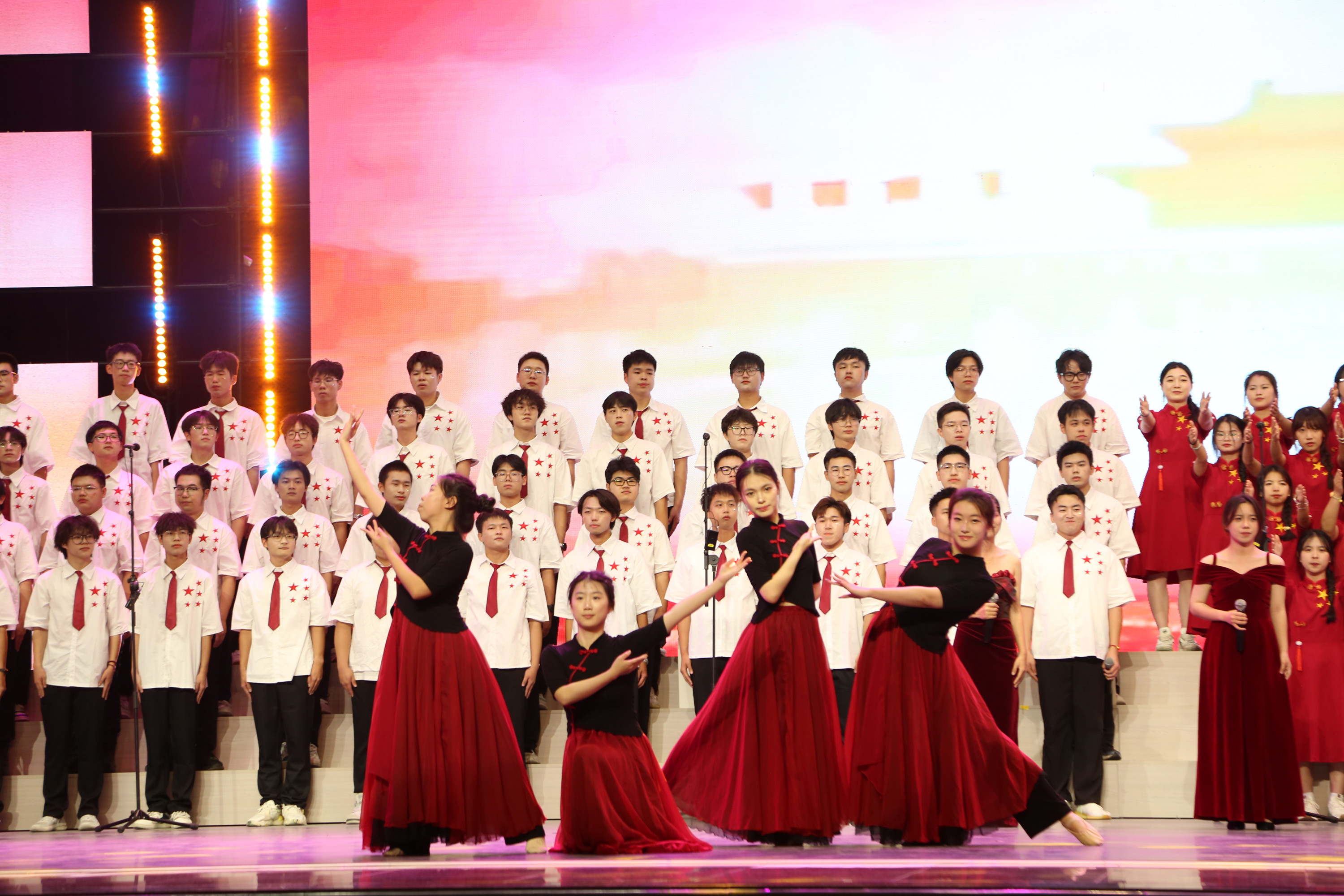 為豐富2025級新生軍訓文化生活,展現新生青春風采,凝聚新生集體向心力,9月26日晚,新生軍訓文藝晚會在第一教學區普照大禮堂舉行。仰恩大學董事會副董事長吳浩鈴,韓國檀國大學副校長張釩星一行,仰恩大學校長王維月、校黨委副書記程如平、副校長狄俊安,各院(系)、部門負責人出席,與廣大新生一起觀看晚會。節目表演現場晚會在寒武紀樂隊的街舞表演中拉開帷幕,動感節奏瞬間點燃全場氣氛。工程技術學院的話劇《永不消逝的電波》生動演繹戰火年代無名英雄的忠誠信仰,傳遞出青年一代對革命精神的弘揚傳承;藝術與教育學院翁佳儀的二胡獨奏《戰馬奔騰》,以激昂旋律展現力量與熱血;法學院的小品《反詐諜中諜》通過不斷反轉的劇情,在歡笑中提升觀眾的反詐意識,彰顯青年智慧;全體新生輔導員的歌曲串燒與管理學院的歌舞表演引發全場共鳴,歡呼不斷;教官彈唱《如愿》將晚會推向高潮,真摯歌聲表達了對新生的美好祝愿,也體現了軍訓中的溫情互動;人文學院的歌舞《大山》舞出對故鄉的深情;大學生藝術團民舞隊的《我和我的祖國》以翩躚舞姿抒發了深切的愛國情懷;外國語學院的朗誦《我愛你,中國》則深情告白祖國。此外,《軍訓那些事》等節目通過脫口秀、合唱、魔術